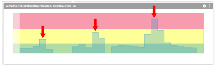 So entdeckte das Team unerklärte Spitzen beim Strahlmittelverbrauch, die periodisch aufzutreten schienen. Es stellte sich heraus, dass durch falsche Wartung das Grobteilesieb regelmäßig verstopfte. Eine nicht unerhebliche Menge Strahlmittel wurde somit über den Überlauf direkt in den Abfall geleitet und musste mit neuem Strahlmittel nachgefüllt werden. Die Aufdeckung dieses Fehlers hat erheblich zur Erhöhung der Prozessstabilität und damit zur Senkung der Nacharbeitsquote beigetragen, da die Verstopfung des Siebs jedes Mal den Prozess aus der Bahn warf und er sich erst über mehrere Tage hinweg wiedereinpendelte.