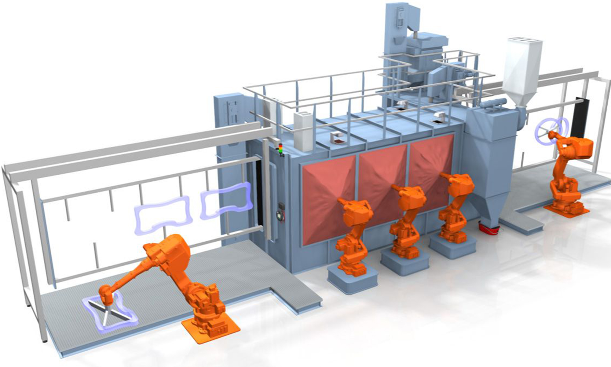 This flexibility is achieved by the ability to adapt the size and number of travelling frames, to the workpiece dimensions and the production rate. On top of these adaptations, the number and position of the blast robots can be adjusted to the customer’s individual requirements.