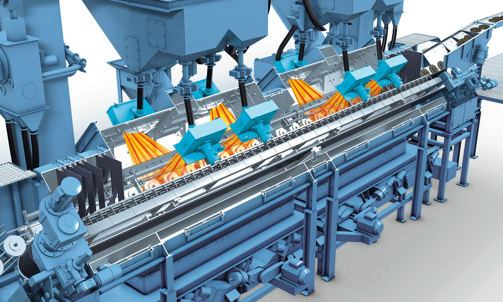 Both lateral faces and the rims of the workpieces undergo focused blast cleaning without blasting interference. Treatment of individual parts in continuous passage (FIFO principle) provides consistent compliance with quality standards and process security. After passing through baffle and guide plates, the contaminants removed during shot blasting pass to a system where sand, scale and undersized abrasive grains are separated. On the outlet side, vibrating or roller conveyors can be provided to transport the workpieces to the next process, according to your requirements.