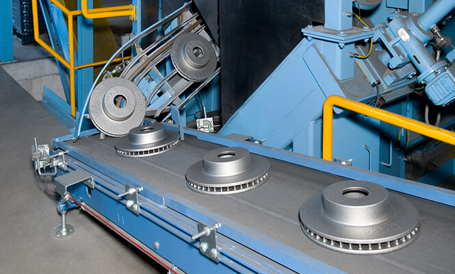 Another guide rail on the opposite side completes the guidance of the workpieces. Belt feed and frictional resistance on the guide rails cause the workpieces to rotate continuously to ensure even exposure to the blast medium and consistent finishing. Even the ventilations (in ventilated discs) are treated at a high standard. The passage speed of the workpieces is controlled by the belt speed which is variable within a predefined range. A workpiece scanning system allows for specific treatment of individual parts.