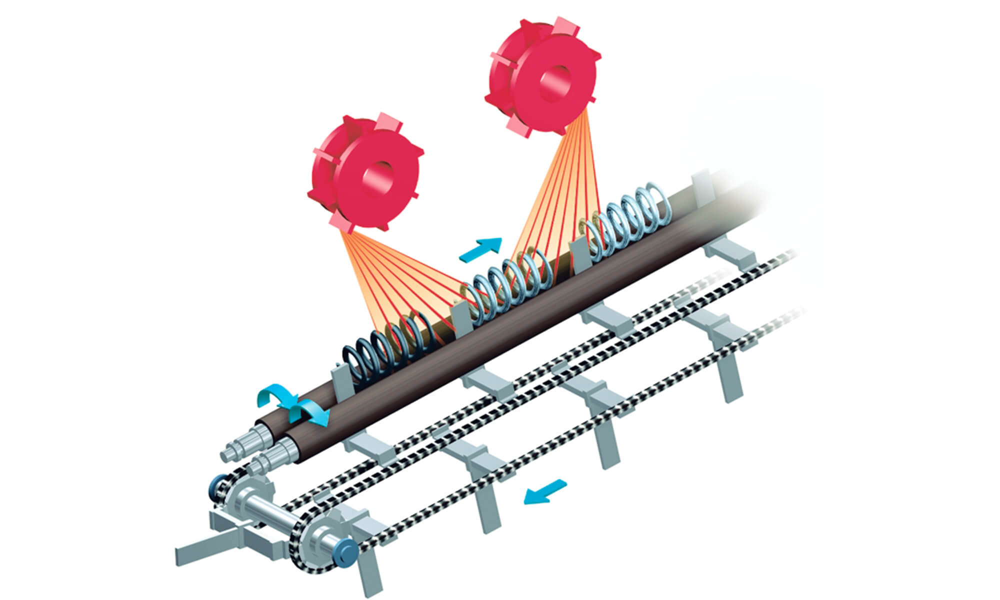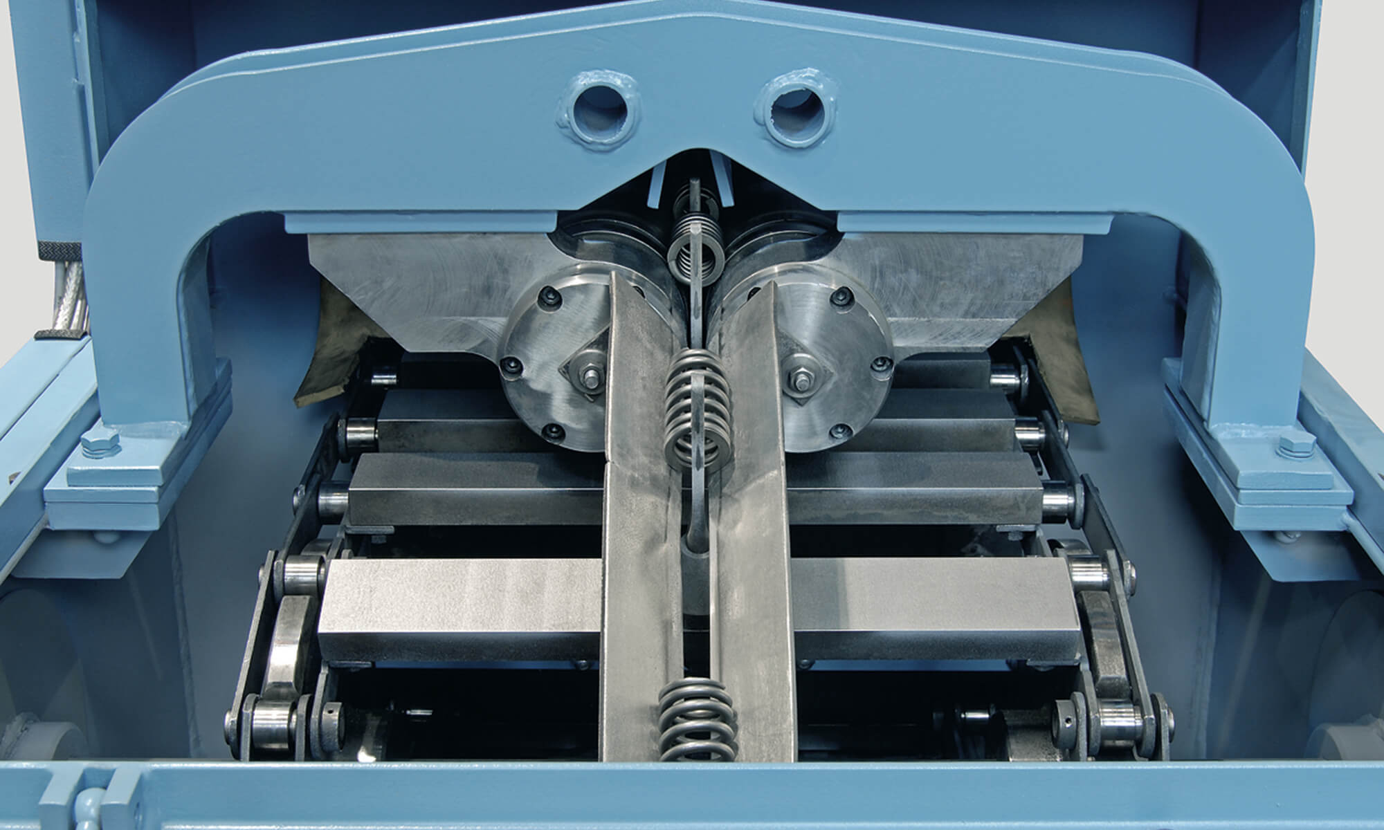 The springs are fed to the machine individually on a straight-line conveyor and then move through the blasting zone. Axial movements are effected by cams attached to chains.