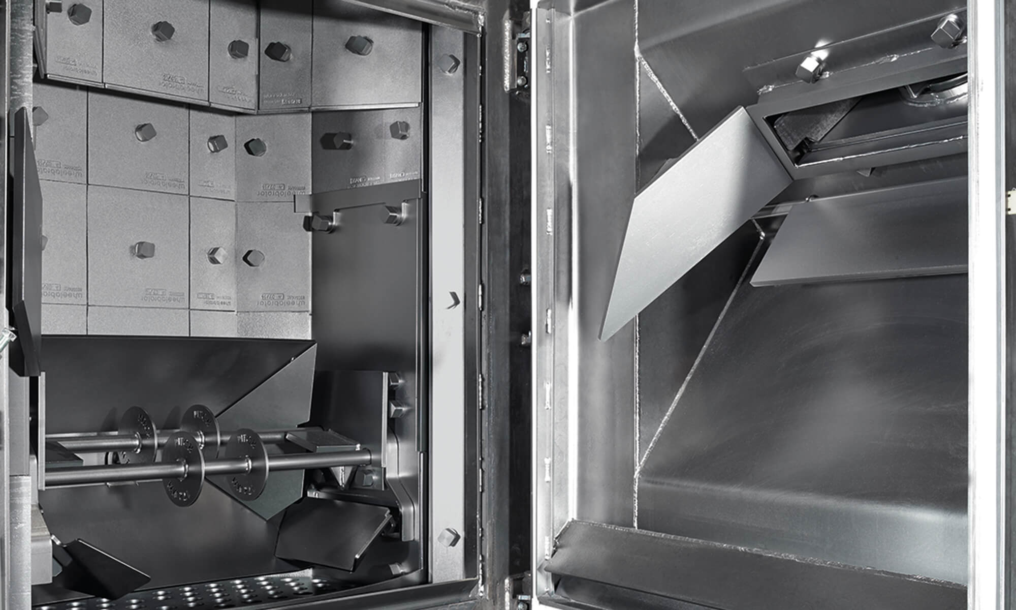 The machine housing has an open loading / unloading area or a door (option for short cycle times) and all functions (loading / unloading, blasting, shot and dust removal) can take place simultaneously to optimise cycle times and increase output.