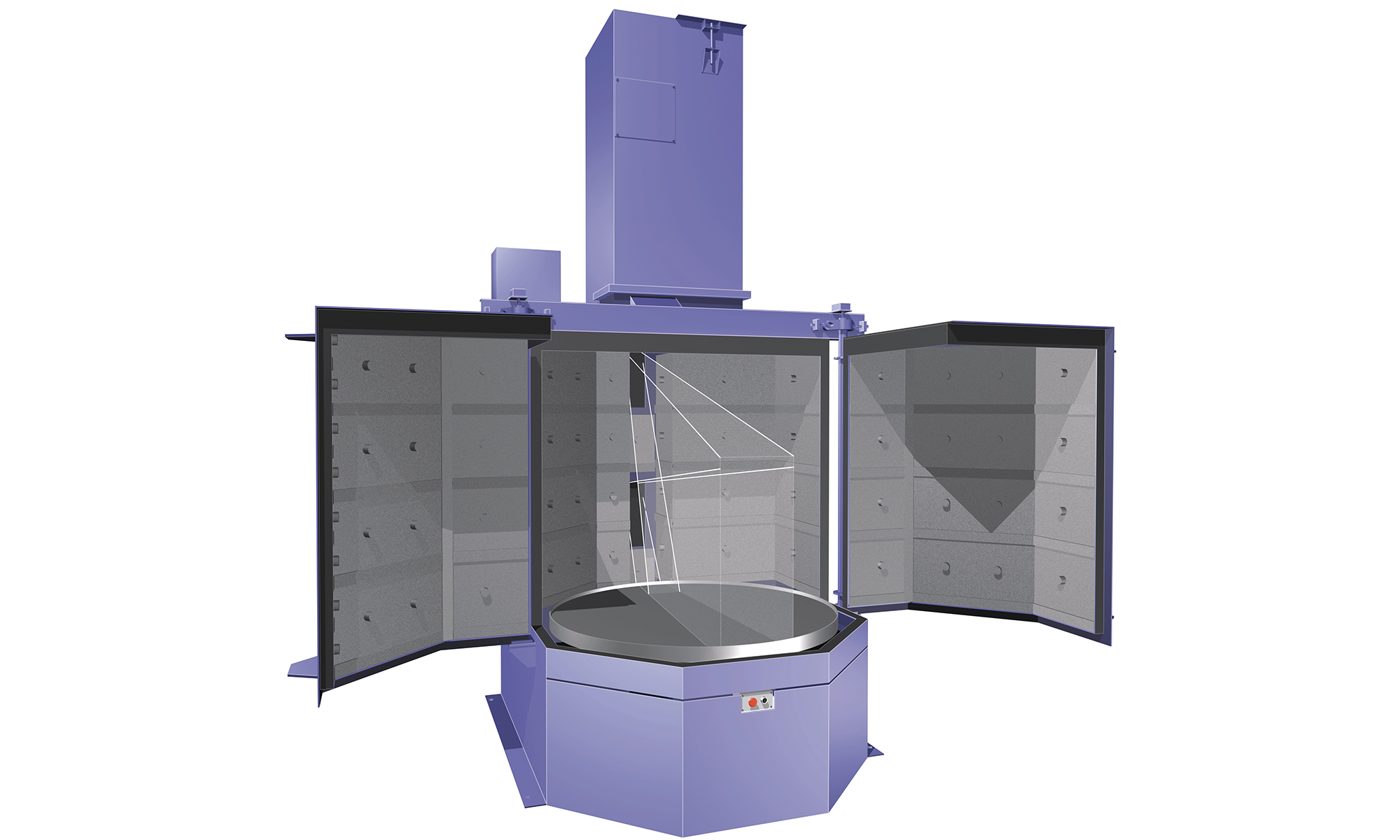 Swing table machines from Wheelabrator Group offer low cost flexibility in your shot blast operations. Whether you are cleaning castings, forgings, flame cut shapes, or weldments, the range of applications is almost endless. Parts or components loaded onto the door mounted table outside the cabinet. With the parts loaded & the door closed, the parts rotate in front and below the blast wheels during the blast cycle and are cleaned from multiple angles. Larger work pieces, fragile parts with protrusions or thin sections that are easily broken can be handled with the table design. The optional second door increases the production efficiency by allowing parts to be loaded or unloaded while work is being blasted inside the cabinet.