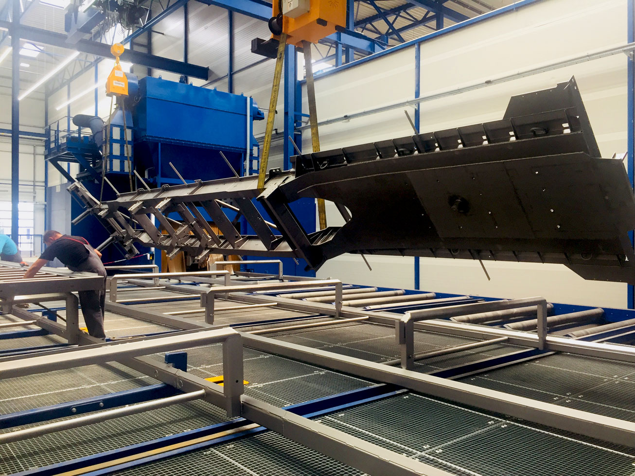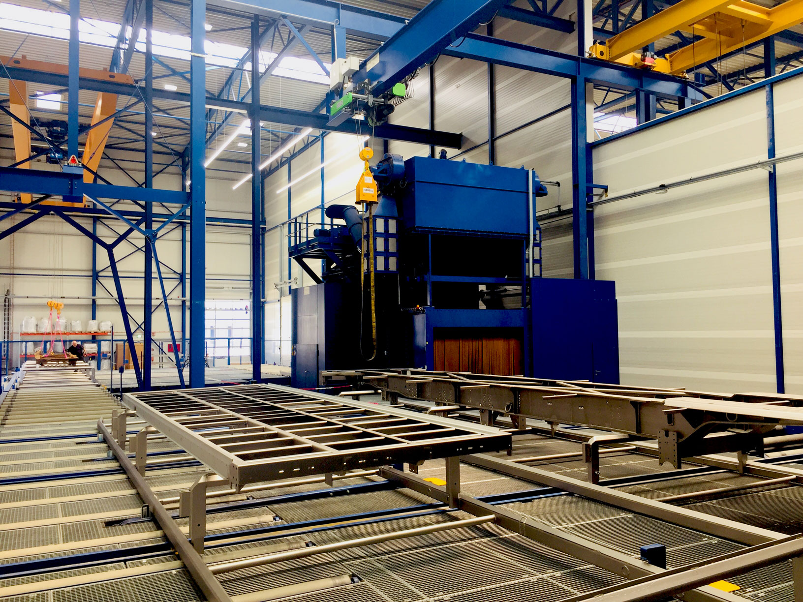 The workpieces enter the machine mounted on special skids, designed by the GIGA Coating team. Made from manganese steel to withstand the repeated harsh treatment inside the blast machine, the challenge when designing the skids was to ensure the blast treatment would reach every area of each chassis.