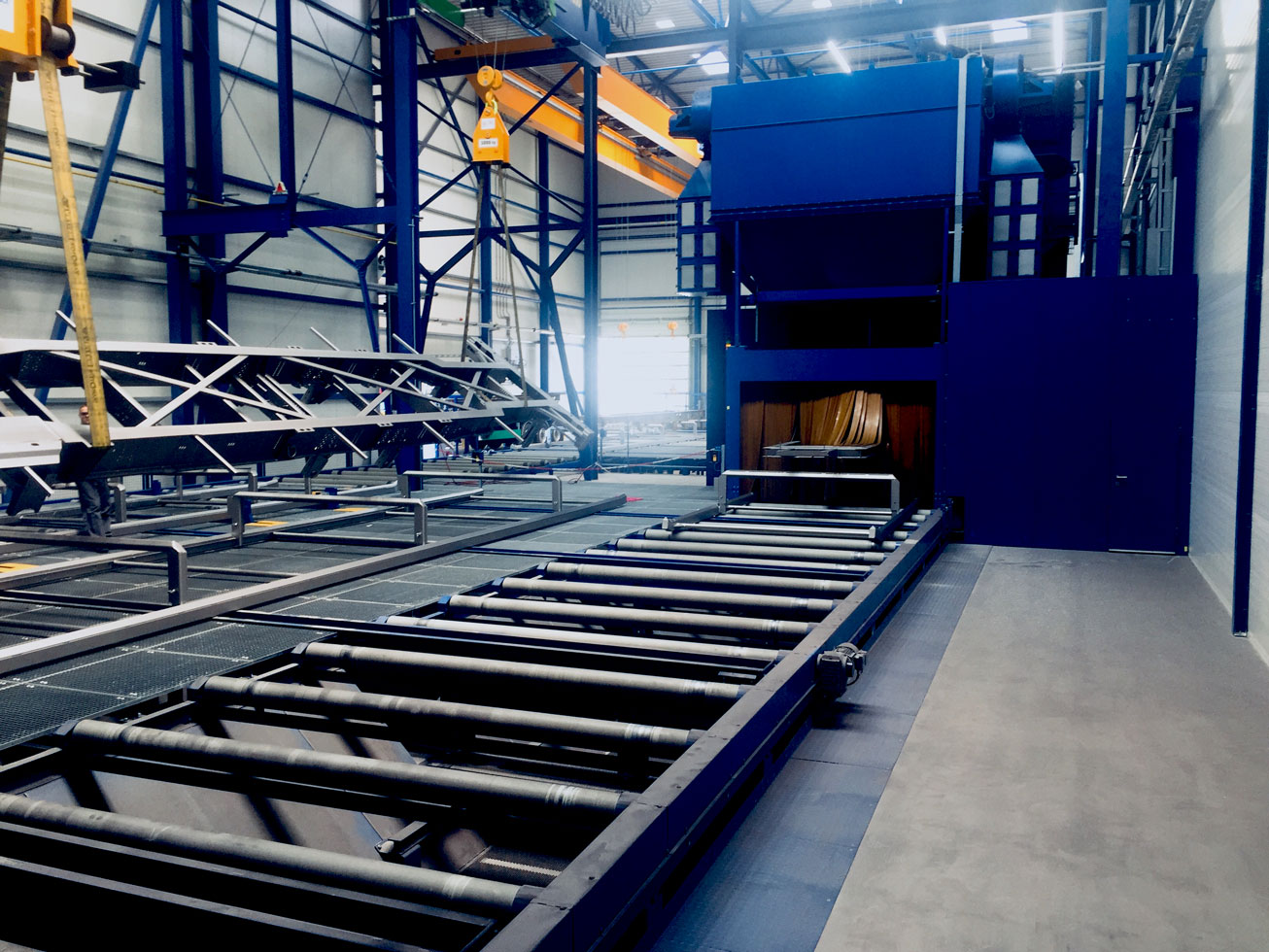 Built on a 25,000m2 plot, the production area measures over 8500m2, 1300m2 of which are dedicated solely to shot blast operations. A Construction Blaster roller conveyor was supplied by Wheelabrator and is able to clean, descale and derust up to three million square meters per year. It is situated right next to the goods-in area for instant feed-in of the extra-large fabricated parts into the coating line. A labyrinth of roller conveyors ensures a constant flow of workpieces through the facility, including the blast machine.