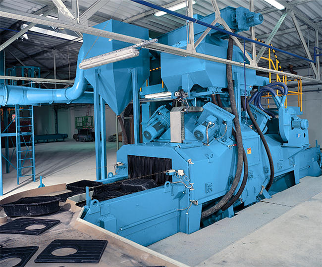 Vulkolan/rubber curtains seal off the blast cabin to prevent abrasive from escaping. A transversely arranged vibratory abrasive conveyer transports the abrasive and simultaneously separates the coarse parts. A blow-off cabin is available as an option to further contain abrasive and clear parts of any remaining shot before exiting the machine.