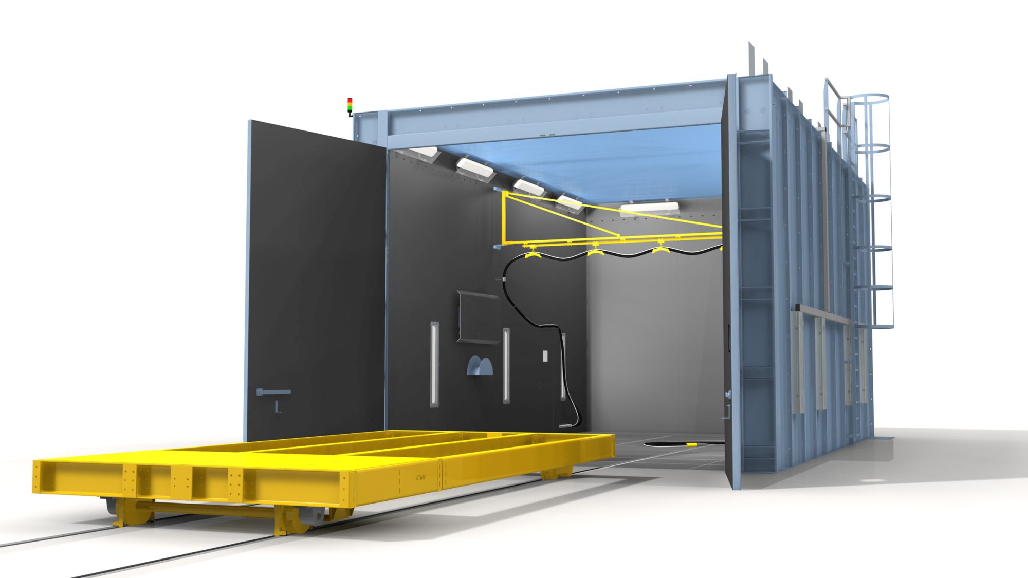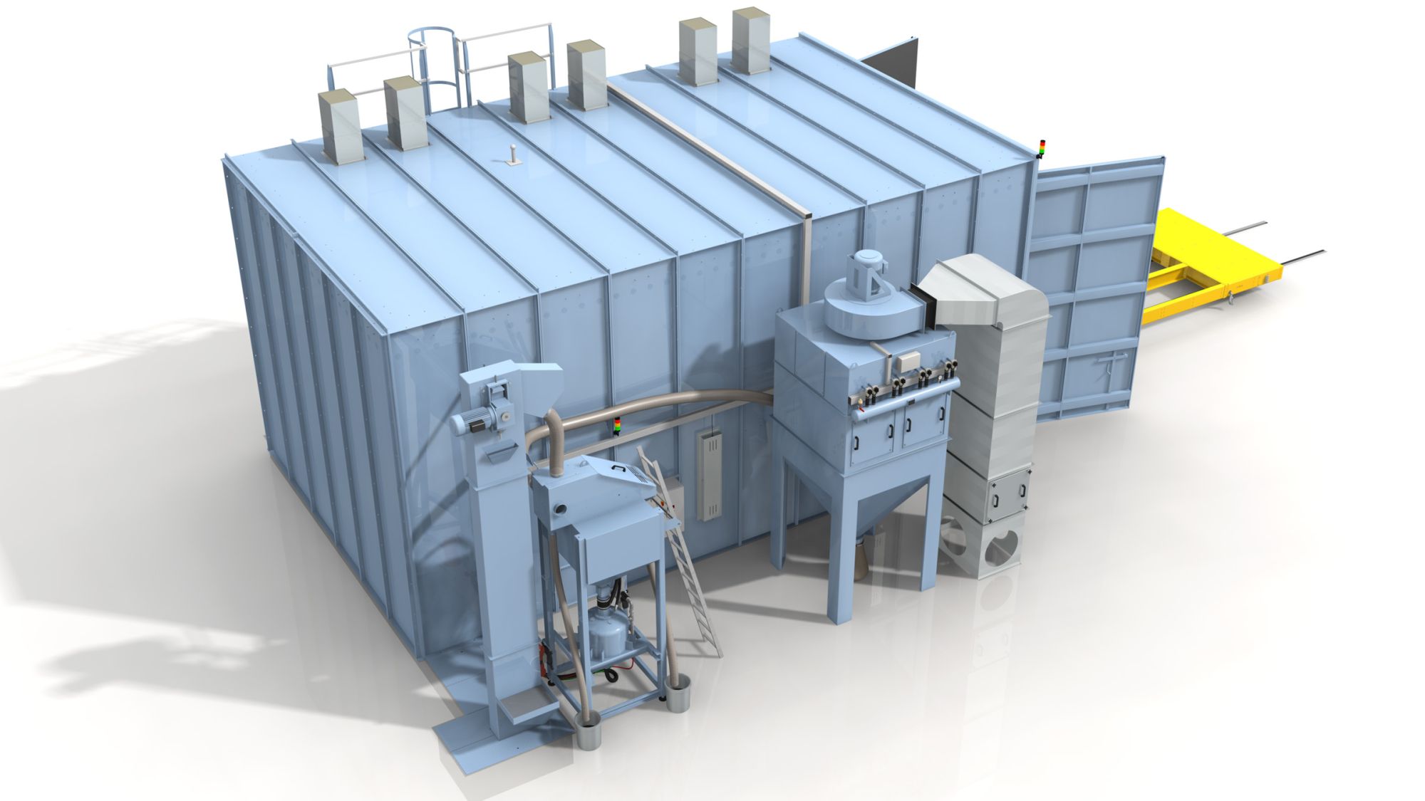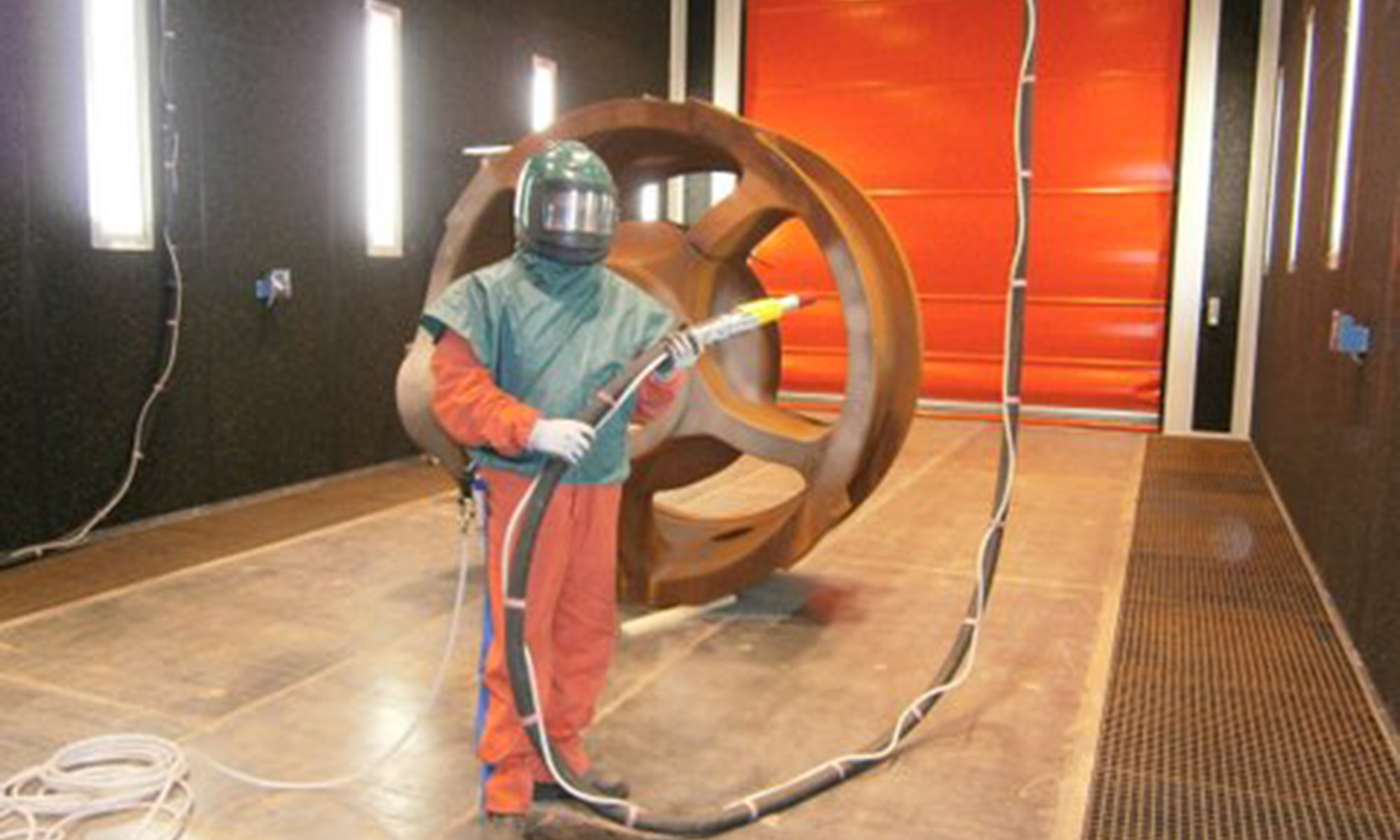 维尔贝莱特喷砂房的主要特征是喷砂过程中操作者处于室内。防护服和头盔可防止操作者受到磨料冲击,通风装置通过头盔为操作者提供新鲜空气。
