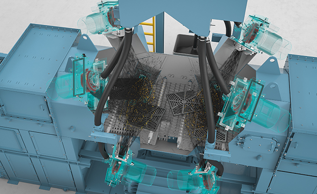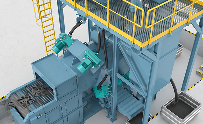 铸件将从顶部和底部被均匀地进行抛丸处理。这对扁平形状零件的稳定性很重要。零件运输可靠(无卡阻),平稳无冲击影响。钢丝网带式输送机的速度、丸料的投射速度和丸料量可调。因此,可以方便地调整抛丸时间和强度,以满足铸件的抛丸要求。