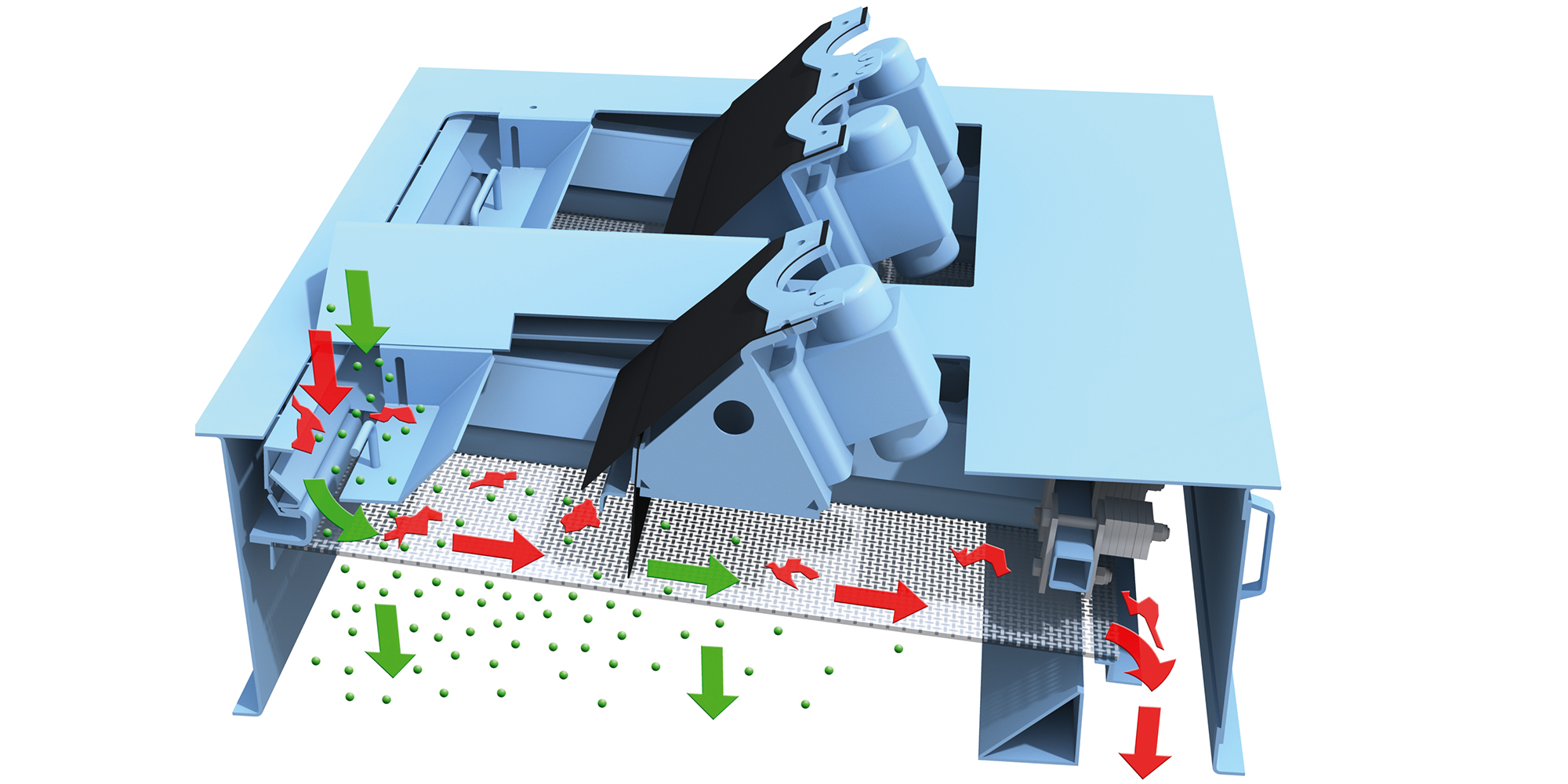 振动筛安装在料仓上方。由两个振动电机驱动,根据工艺需要的网眼尺寸实现筛分去除不需要的颗粒。颗粒通过溜槽进入料箱。侧门可方便地进入振动筛,便于维修。